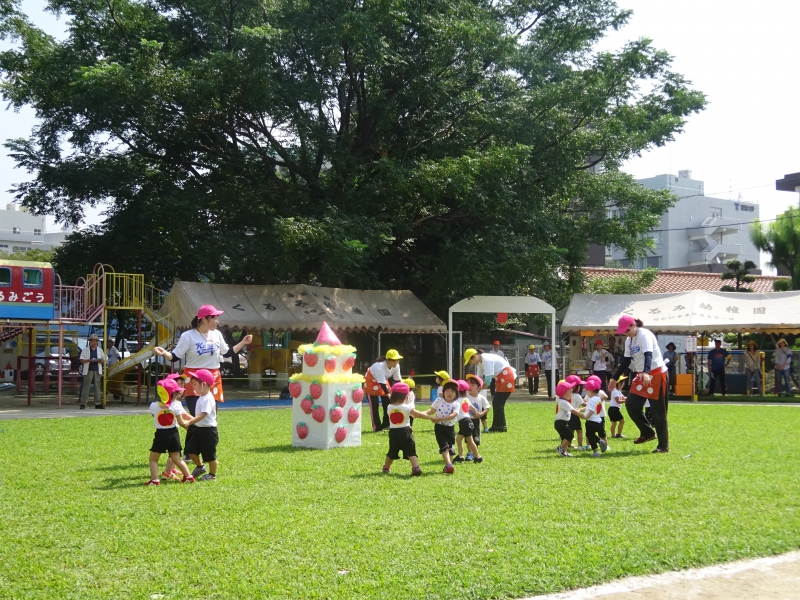 5歳児がバトンを持って、園庭を走り回ります。 5歳児の姿に触発され、3歳児や4歳児も次々に楽しそうに走り回ります。