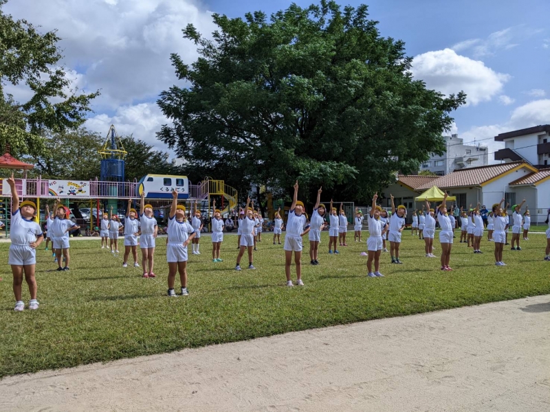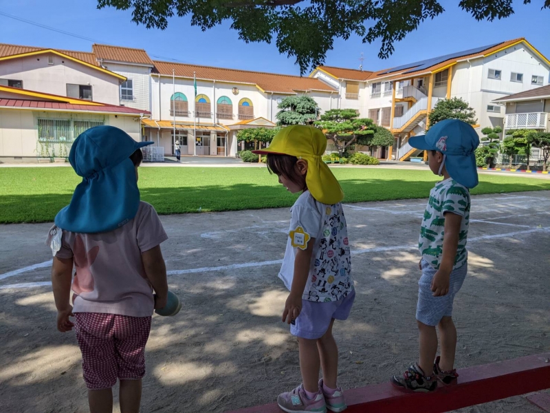 午後には、3歳児が「開閉会式練習」を行っていました。 まだまだ日差しも強く、給食の後でもあり・・・ 思わずボッ〜としてしまう・あくびが出てしまうのもご愛嬌です😊👍 そんな中でも、自分の体に言い聞かせ、ベストを尽くしている姿もありました☆ミ