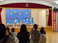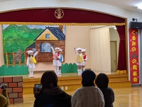 ステージ上で、互いに見つめ合い、楽しそうに参加する子どもたち。 お友だちが、セリフや移動することを忘れてしまうと、そっと小さな声で伝えたり、指で伝えたり、一緒に移動してあげたりする姿等もありました。 お友だちの衣装の一部が落ちると、そっと拾い上げ、何事も無いように移動しばがら、そっと落とし物を渡す子ども。