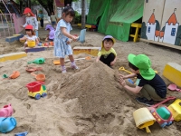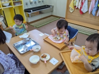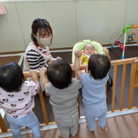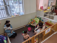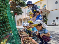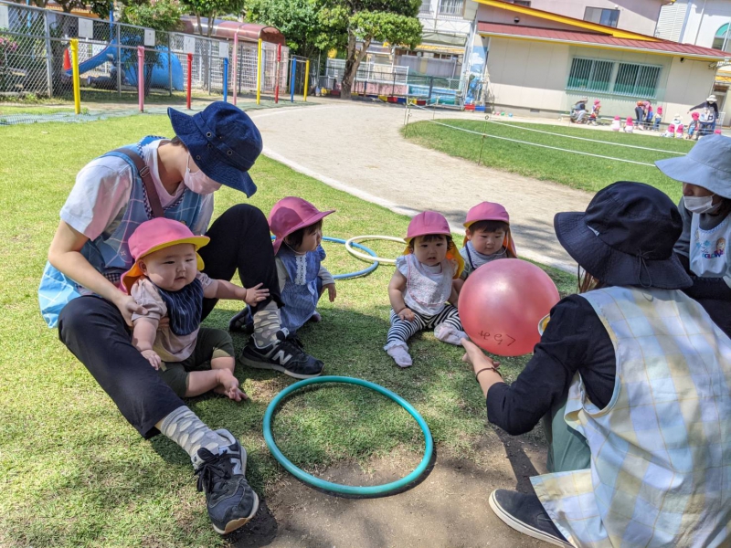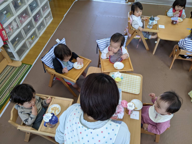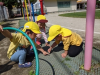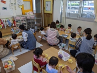 芝生の上で、自然と笑顔が溢れ出す0歳児Aちゃん。 0歳児Cちゃんや1歳児Dちゃんの頭や背中を、同時に撫でる1歳児Bちゃん。 クレパスをたくさん使用し、夢中になってお絵描きをする2歳児。 『(コップの水がかかって)ごめんね』と、お友だちへ自然と伝える3歳児Eくん。 『お誕生日おめでとう!だって、メダルがあるんだよ!!』と、自分の喜びのように伝える4歳児Eちゃん。 園庭のお地蔵さんに向かって、自身のお願い事やまわりの人たちの安全や健康をお願いする5歳児。 雨を眺め、『(口に入れたら)美味しいよ!』・『洪水になっちゃう。大丈夫かな?』・『カエルさんは喜ぶから、雨が降った方が良いよ!』と、心の声が自然と溢れる出す5歳児。