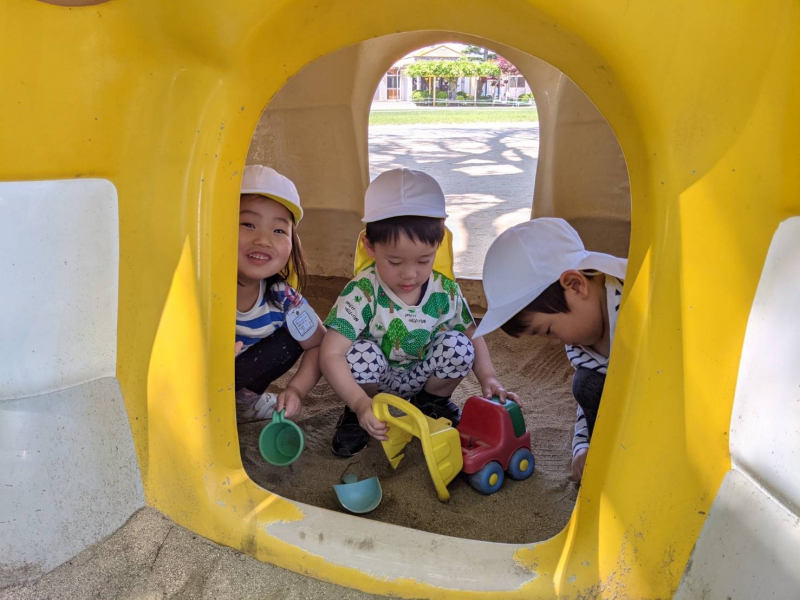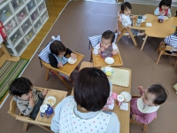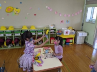 保育室や園庭では・・・ ◇製作で、粘土・折り紙・クレパスやハサミ等を、器用に使いながら、思い思いに夢中になって、作品を作る。 ◇保育室で、みんなと一緒にゲームで盛り上がる。 ◇空を見上げ、青空の広さに驚き、飛行機や飛行機雲等を眺め、心を豊かにする。 ◇手洗いやトイレに行くだけでも、お友だちと話が大盛り上がり。 ◇カメさんや蟻・ダンゴ虫を、ジッ〜と眺める。 ◇園庭に遊びに来るスズメさんたちを、楽しそうに追いかける。 ◇砂場で、砂の感触を楽しみ、穴掘り屋さんやお料理屋さんに変身する。 ◇ブランコ・すべり台・ジャングルジムやくるみ号等に乗って、風を感じる。 ◇鯉のぼりを見上げ、その大きさに驚き、その色合いに心を弾ませる。 ◇走ったり、歩き回ったりする範囲が、日に日に広がる。 ◇環境に少しずつ慣れ、体も動かし始めたこともあり、給食も少しずつ進む。 等