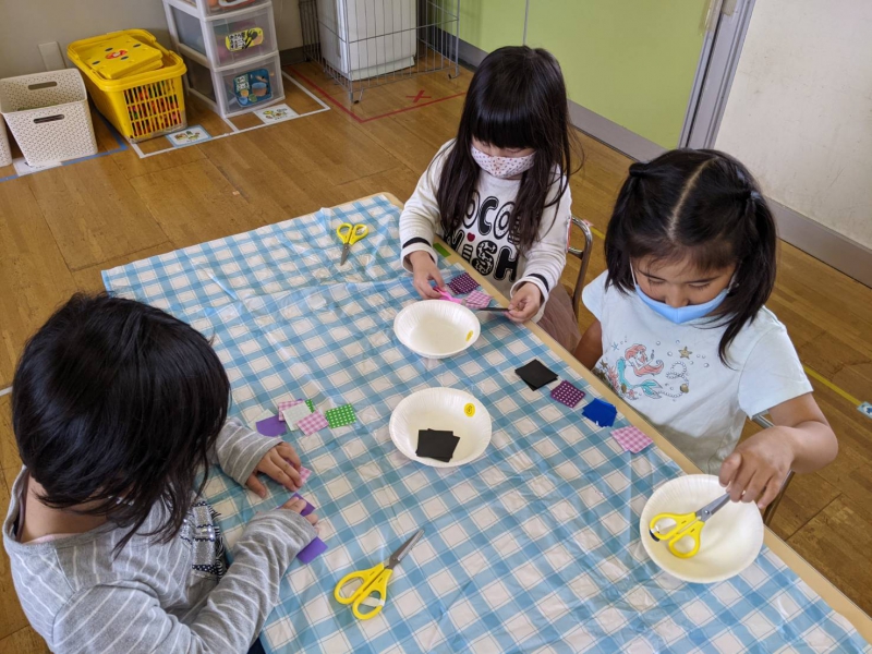 粘土で、イメージを形作る。 お誕生会で、お友だちの喜びを、自分のことのように喜ぶ。 新聞紙を思い切り破き・投げ、楽しい空間を作る。 みんなで「フルーツバスケット🍌🍊」を行い、楽しい輪を広げる。 文字や製作に、楽しく・集中して取り組む。 等