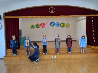 園旗の前にも、集まっていました。 本日は、弔意表明として、『半旗掲揚』としています。 先生が、地震について話をしていました。 熊本地震について、大切なことを子どもたちへ伝えていました。