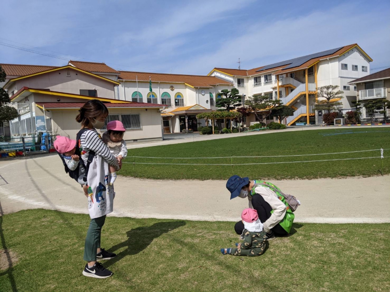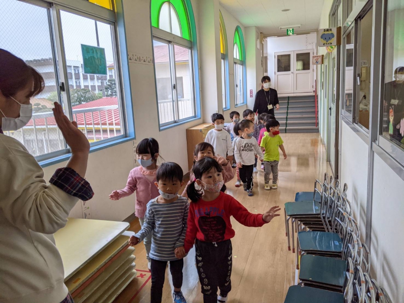 2『園児の受け入れ・引き渡し』 ■受け入れ場所➡1階保育室前テラス □受け入れ時間➡ ◆2号認定(標準時間)&早朝預かり(みかん組)利用者=7:30〜9:30 ◆1号認定&2号認定(短時間)=8:30〜9:30 ※お子様を預けた後は、速やかに移動をお願いいたします。 ■引き渡し場所➡(園駐車場内)バス停 □引き渡し時間➡ ●3歳児➡11:20〜11:30 ●4歳児➡11:30〜11:45 ●5歳児➡11:45〜12:00 ※バス停での密を考慮し、分散で引き渡しをさせていただきます。 ※兄弟姉妹がいる方は、早い時間帯での引き渡しとなります。 ※上記の時間帯での迎えが難しい方は、受け入れの際にご相談ください。 ※4/19(月)から引き渡しの時間は変更します。 ※通園バスは、運行します。 ★「預かり保育利用者の引き渡し」は、1階保育室前テラスで行います。