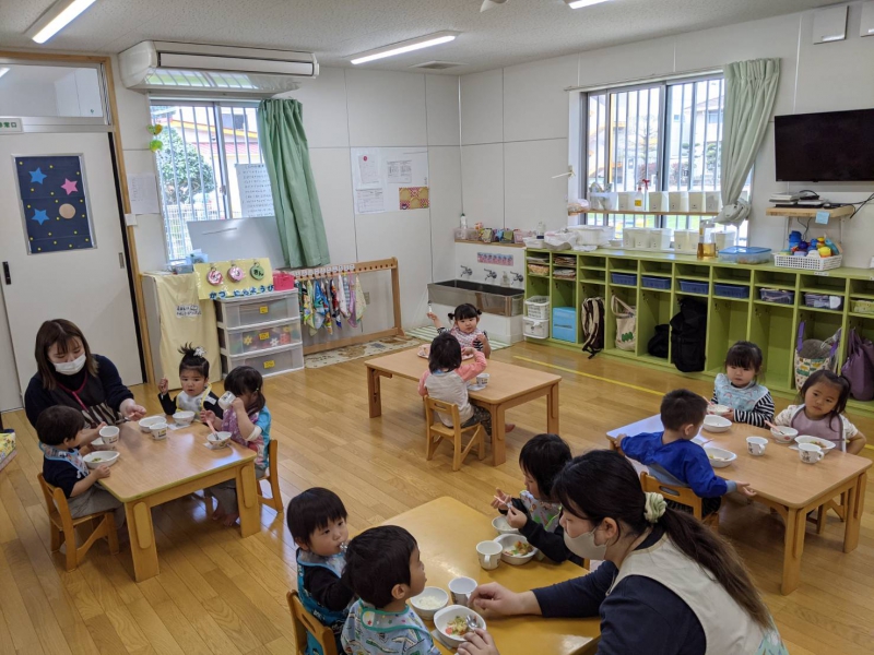 そんな中で・・・ 給食時に、1歳児Aちゃんが、隣の椅子に座ることを戸惑っていたBちゃんに気づき、笑顔でそっと椅子を引き、座ることを促している姿がありました。
