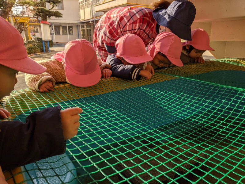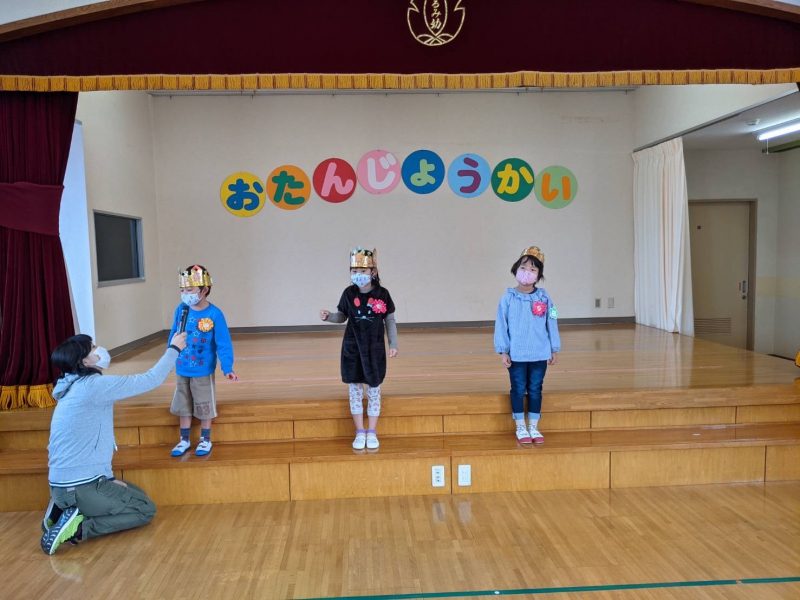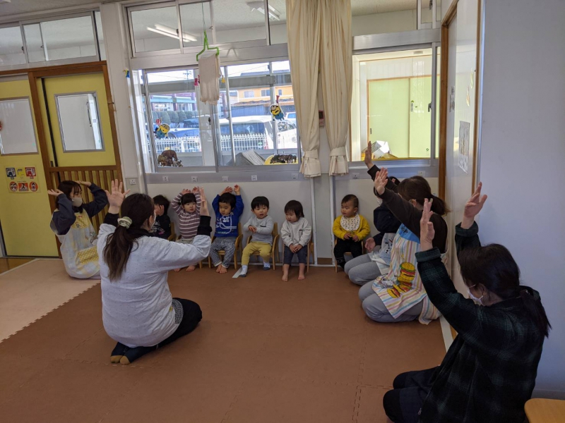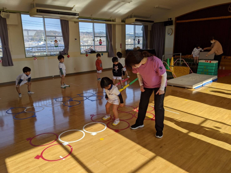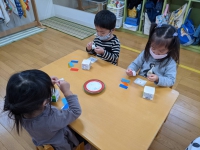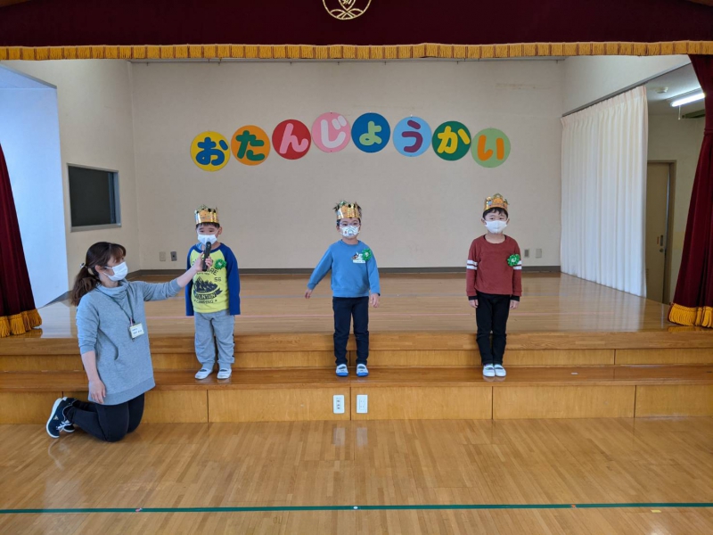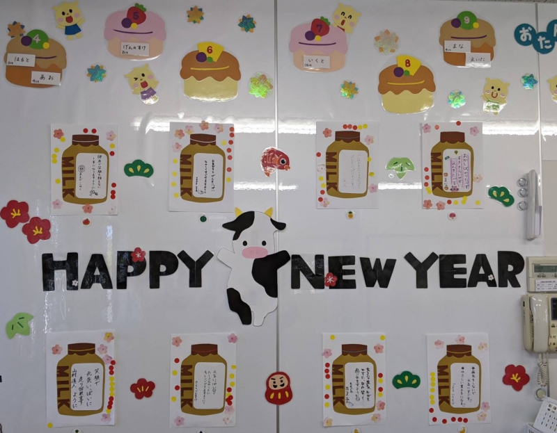 『お年玉、100個もらった〜!!』と、嬉しそうに伝える4歳児Aくん。 『先生も、(お年玉)もらったらいいのに〜』と、優しい言葉かけをする4歳児Bくん。 『お正月も、(お手伝い等)頑張った』と、笑顔で伝える5歳児Cちゃん。 『(お正月の)ご飯が凄かった(豪華だった)!もう食べられない!!』と、嬉しそうに話す3歳児Dちゃん。 『あけましておめでとうございます』と、しっかりと足を揃え、頭を下げながら、丁寧に伝える3歳児Eくん。 その様子を、ジッと眺める他のくるみっこ。