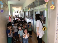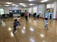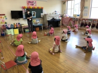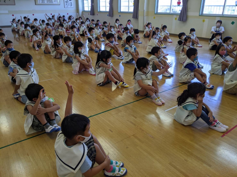 そんな中、園内放送に耳を傾け、時折大きな声で返事をする「満3〜4歳児」のくるみっこ。 5歳児は、ホールに集まって実施しました。