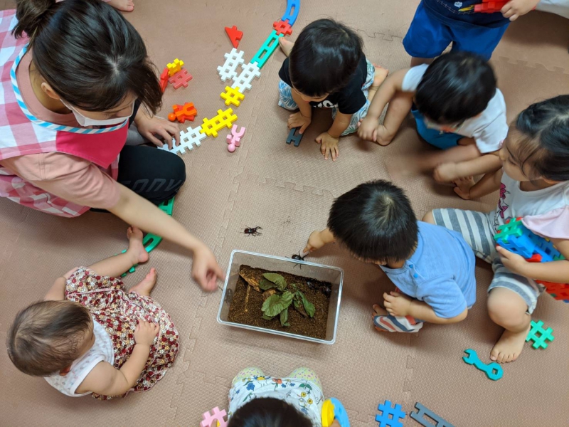 また、0〜2歳児のお部屋で、クワガタを見せる機会がありました。 フッと目をやると、足が一本無くなっていました。 一緒に飼っているクワガタと喧嘩をして、無くなってしまったのかもしれません。