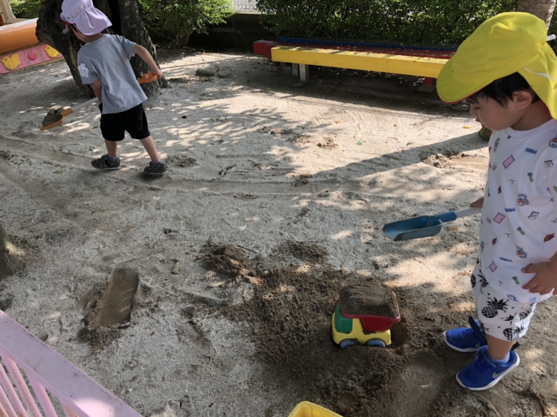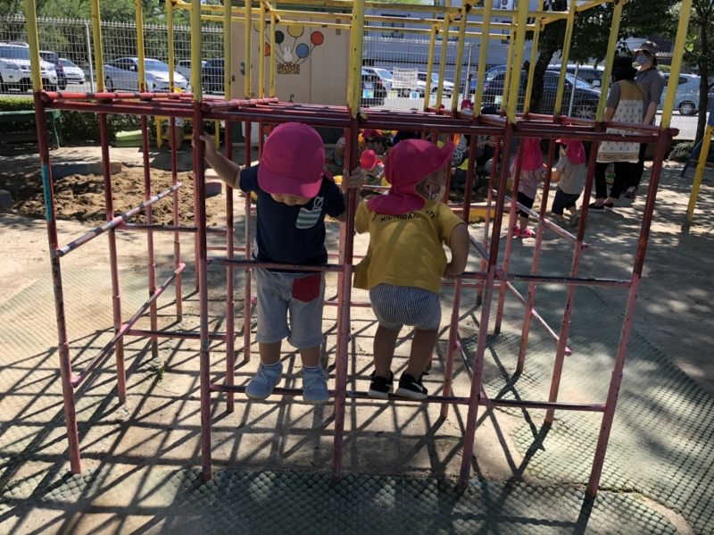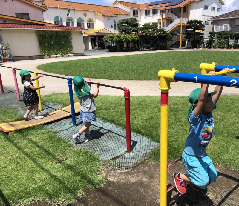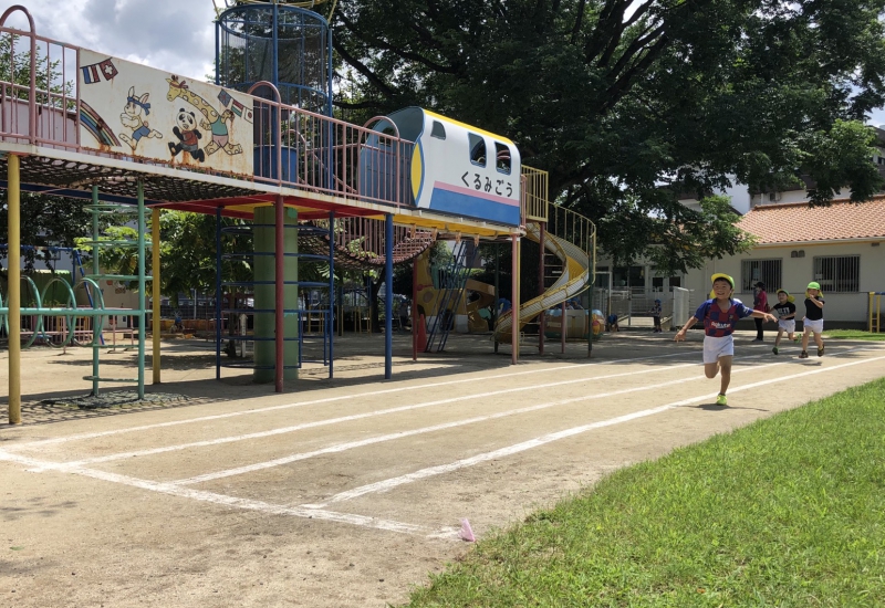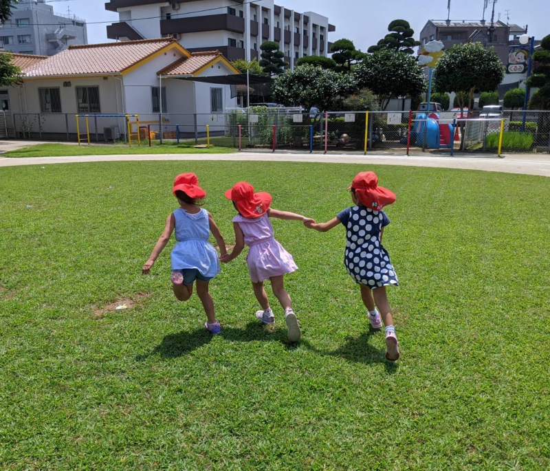 さて、先日までの雨が嘘のように、今度は暑さが続き始めました。 そんな中、緑の芝生へ飛び出し、木陰の下で汗をかきながら、夢中になって遊び込む姿があります。 コロナウイルス対応に伴い、園生活が段階的に進む中、体力や生活面において、まだまだ十分に取り戻す・積み重ねることが出来ていませんが、少しずつ園の中で楽しみを見出し(見出そうとし)ているところです。