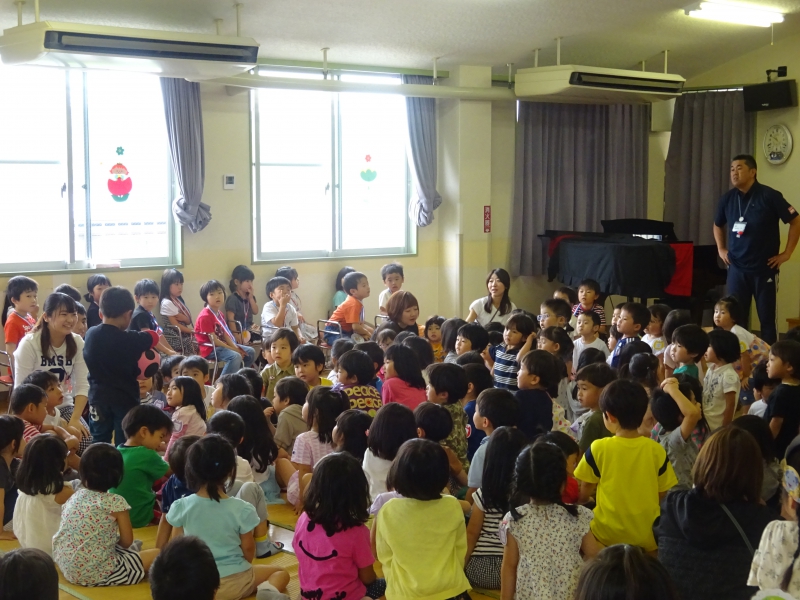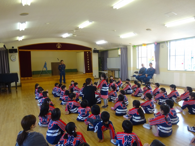 本日、詫麻消防署から3名の消防士さんに園へ訪問して頂き、『幼年消防結団式』を実施しました。 代表の5歳児さんが、貴重な話に耳を傾けていました。 地震・火事や水遊び等についての話もありました。