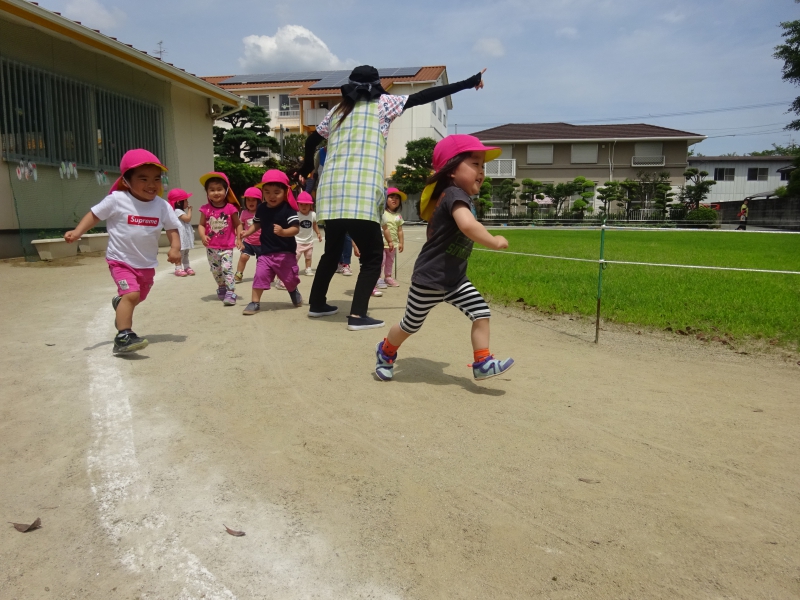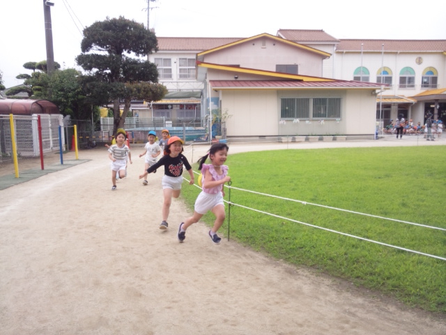 そんな中、暑い日差しの下で、あるクラス(5歳児)が、元気っこ(体育)クラスで・・・ 暑さに負けることなく、元気に園庭でかけっこをしている姿がありました。