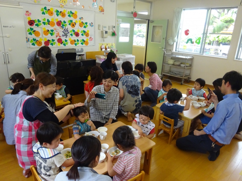 最後に、園庭にある木陰に移動し・・・ 心地良い空間の中、みんなで美味しい「愛情弁当」を、頬張りました。 食べたり、オシャベリしたり等、楽しい時間が続きます。 デザートにも、自然とかぶりつきます・・・(笑)