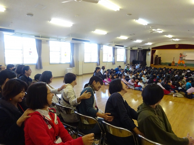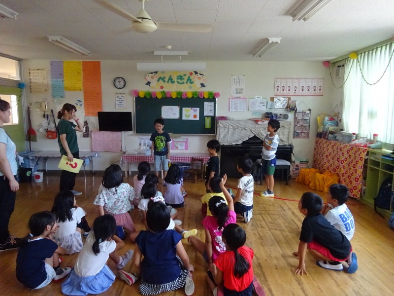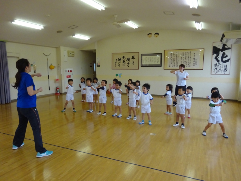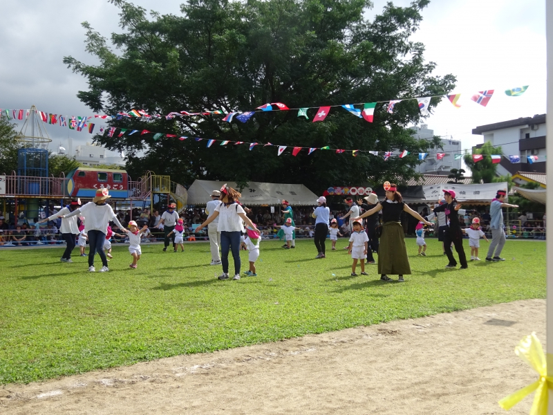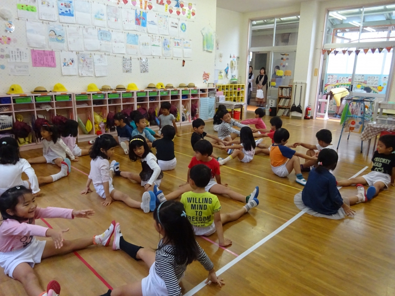 早速、隣のお友だちの肩を触ったり等しながら、『大きなカブごっこ』も行いました。 「ヨイショ!ヨイショ!!」 互いに引っ張り合いながら、笑顔(役員の皆様や先生含む)が溢れます。