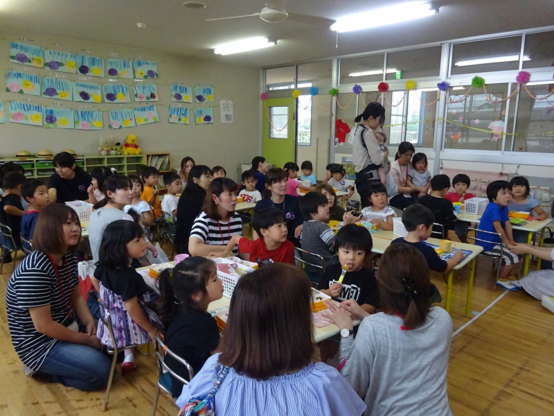 大好きな人たちと一緒に登園し、園庭に集合します。 みんな笑顔いっぱいで、やって来ました。 手には、可愛いお弁当箱も持ち・・・ 気持ちも身体も、ワクワクしている姿がありました。