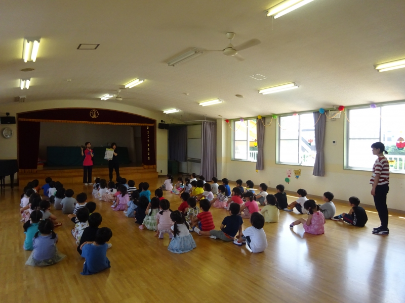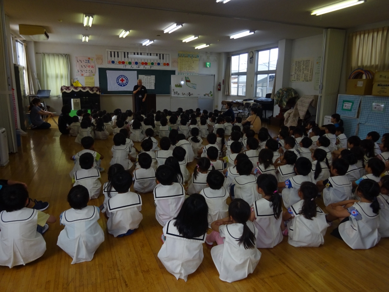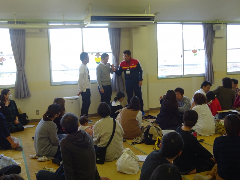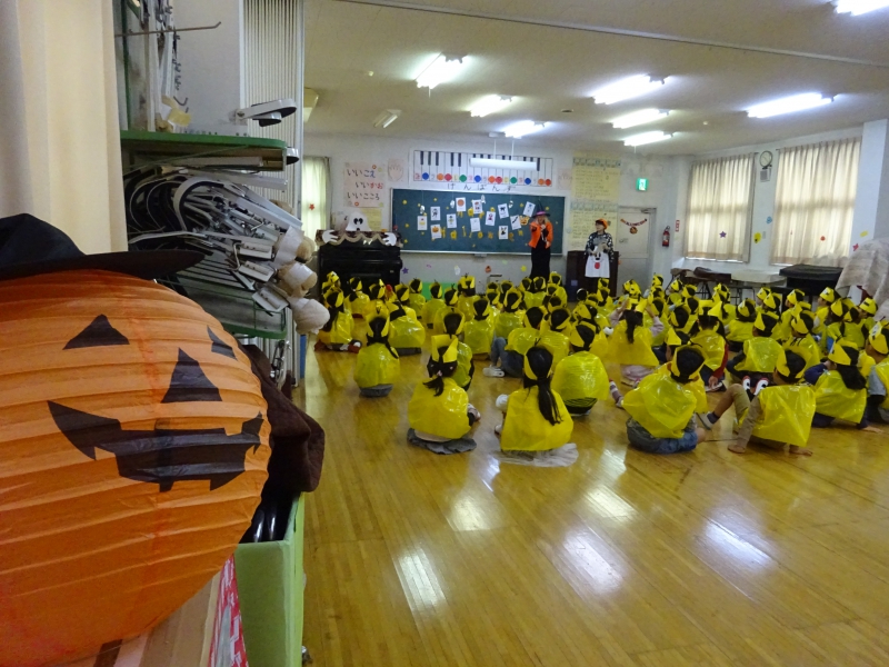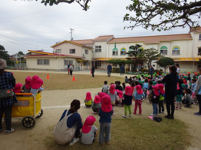 その後、消防士さんからの大切なお話がありました。 「地震と言われた時に、だんご虫ポーズになっていたのは、とても良かったです」 「先生たちの話を聞いて、行動していたことも、とても良かったです」 ちょっぴり、嬉しそうな・誇らしげな表情をする子どもたちの姿もありました。