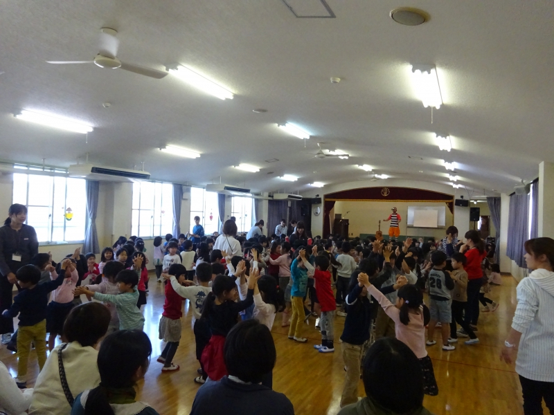 役員会終了後、全園児が「なかよしルーム」に集合して、『お楽しみ会』を満喫しました。 今回は、ケロポンズとも交流がある『福田りゅうぞう(カエルちゃんOFFICE)』さんが、東京からやって来てくれました。 元保育士でもあるりゅうぞうさんは、朝の諸準備で来園された時から、全身からエネルギーや楽しいオーラが、一目見た時から伝わるが人であり・・・ 現在、遊びダンス作家として、各地を飛び回っているようです。