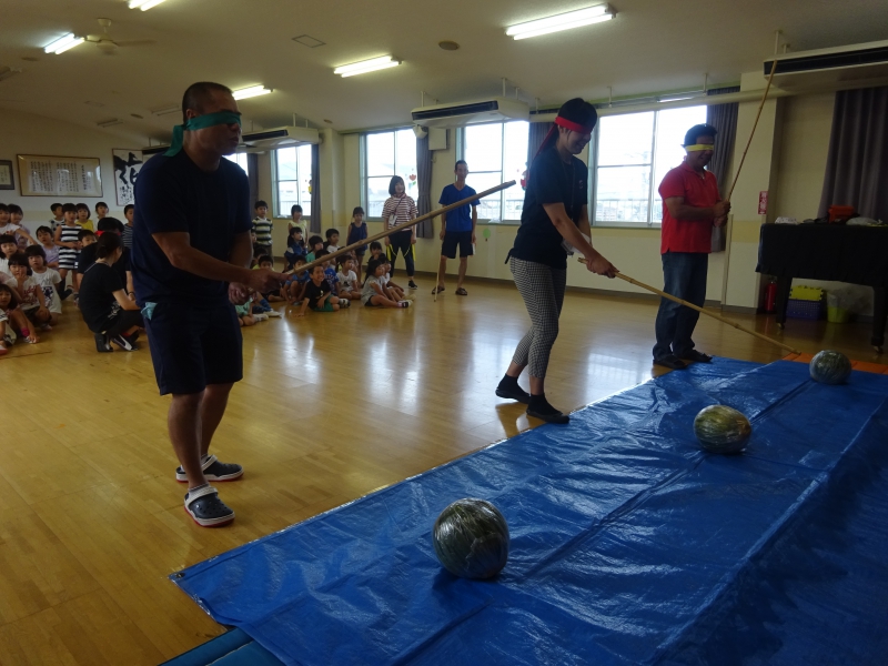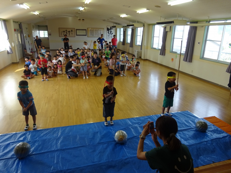 早速、なかよしルームに集合して、「すいか割り」を行いました。