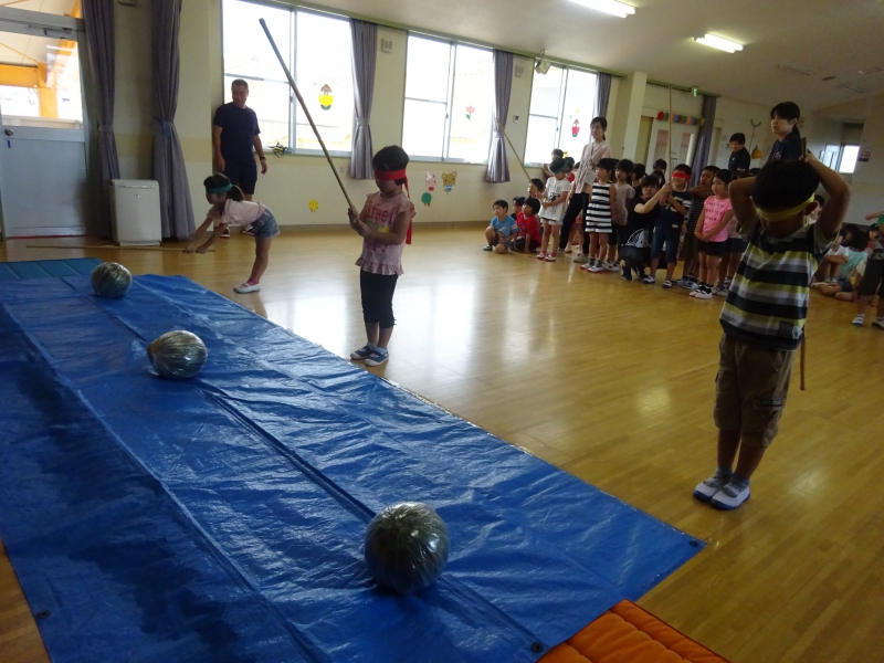 一生懸命トライする子ども。 緊張して、一歩が踏み出せない子ども。 思い切って、竹の棒を振り下ろす子ども。 こっそり目隠しをずらし、目標を定める子ども・・・(笑)