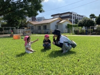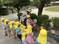 お片づけの音楽が園庭に響き渡ると・・・ 捕まえた『ダンゴムシ』を、丁寧に草木に逃がそうとする5歳児Fくんの姿もありました。 その様子を見ていたGくんやHくんも一緒になって、ダンゴムシを逃がす一番良い場所を探し・・・ 最後にそっと木の下のお友だちに踏まれないような場所に、みんなで逃がしている姿がありました😊👍