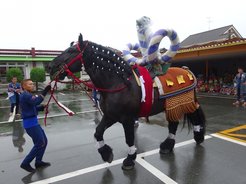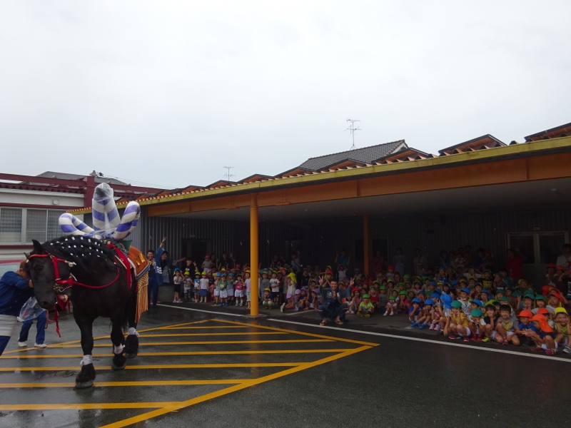 小雨が降る中・・・ 「藤崎八旛宮の秋季例大祭」の『飾り馬』が、園にやって来ました。
