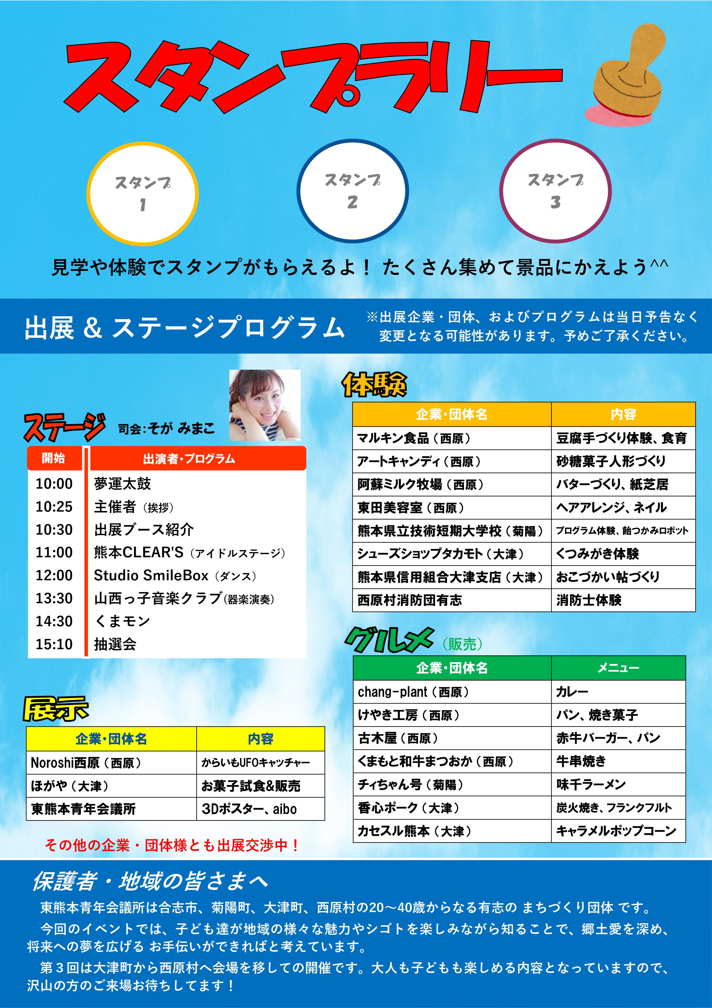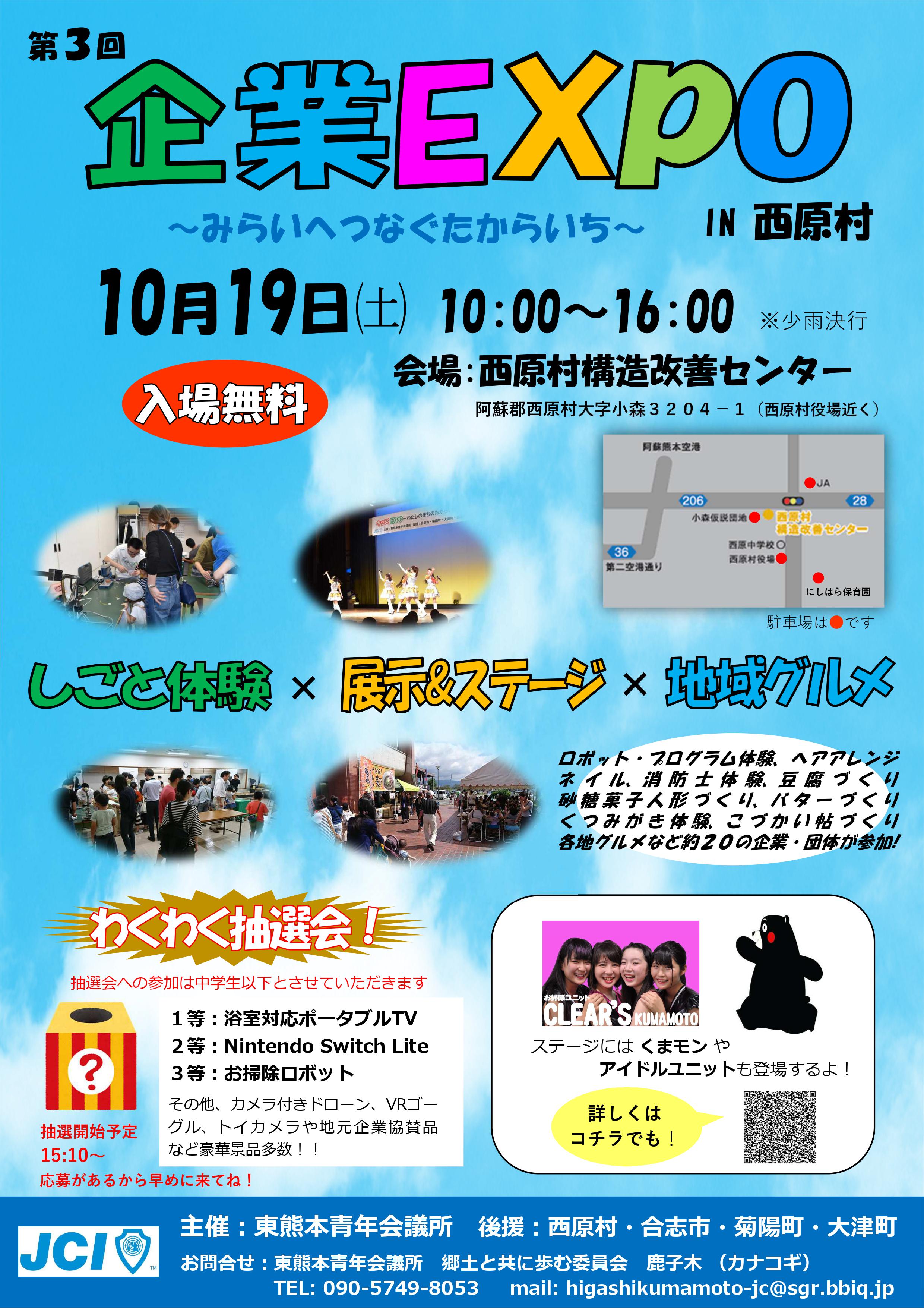 10月19日(土)に第3回『企業EXPO』を開催いたします! 今回は会場を大津町から西原村へ移し、約20の企業・団体様に出展いただきます。 他にもステージイベントやスタンプラリー、お楽しみ抽選会など楽しいコンテンツが盛り沢山です。 多くの皆さまのご来場を心よりお待ちしております(^^)/