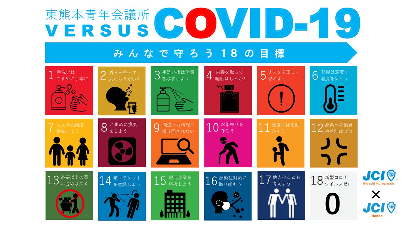 これから社会活動が再開していく際に、いま一度新型コロナと正しく向き合い「地域の暮らしを守る」ツールとして地域の皆さまにもご活用いただき、ともにコロナショックを乗り越えたいと当会議所バージョンを作成いたしました。 東熊本青年会議所はこの目標のもとコロナ対策運動を発信してまいります。